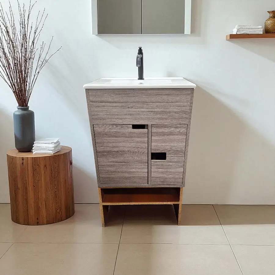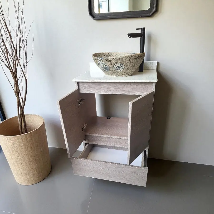 Mueble para lavamanos de diseño moderno y funcional, ideal para optimizar el espacio en tu baño. Fabricado en materiales resistentes con acabado en variedad de colores, incorpora mesón en cerámica o mármol para mayor durabilidad y estilo.
